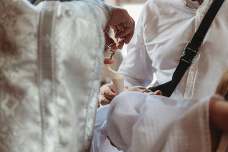 A tender moment of a baby's baptism ceremony, capturing the hands of a priest pouring water over the infant's feet symbolizing spiritual cleansing and rebirth.