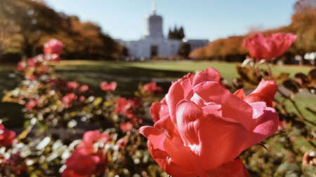 A pink rose in a garden surrounded by greenery with a white building on a blurry background