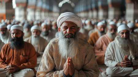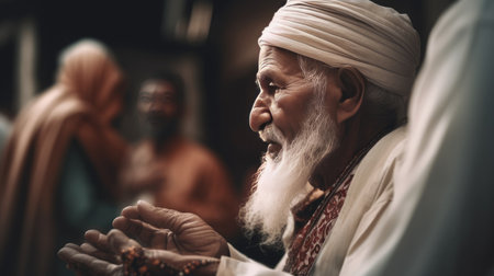 an old man wearing a white turbal and holding his hands together with the other people in the background. Generative Ai