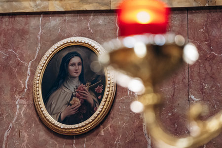 Candles lit in the church with the altar and christian icons in the background. Roman Catholic religion. Religious concept