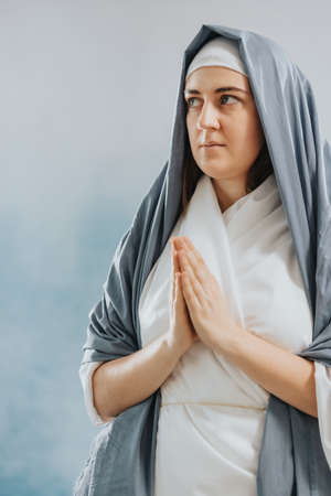 Mother of God in blue and white robes praying alone