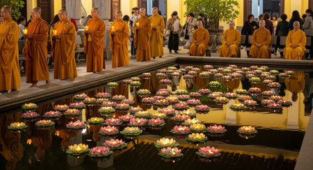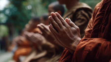 A group of monks with joined hands in prayer, exuding tranquility and spiritual depth, set in a serene outdoor sanctuary.