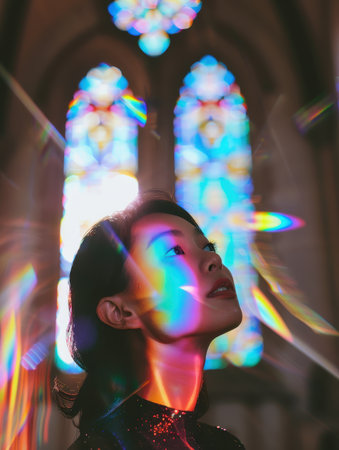 Soft rays of colored light cascade through stained glass, creating a serene atmosphere as an individual kneels in prayer at the altar.