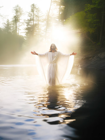 Baptism. Jesus in white, standing in the water with his arms open, blessing