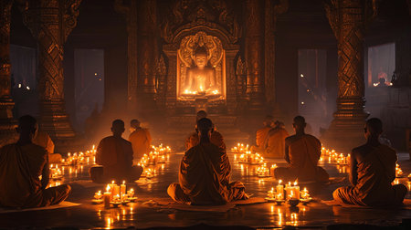 Experience the serene and tranquil atmosphere of monks deep in meditation inside a centuries-old temple bathed in the soft glow of candlelight Find inner peace and spiritual harmony in this captivating work of art