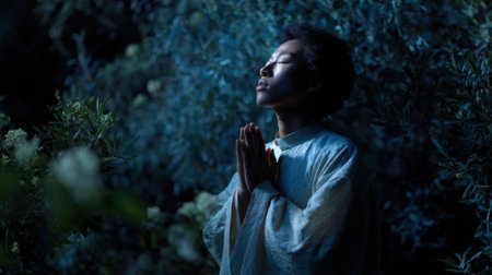 Concept photo of a person standing in the moonlit garden, their eyes closed and palms pressed together in prayer, as if communing with the divine