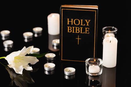 lily, candles and holy bible on black background, funeral concept