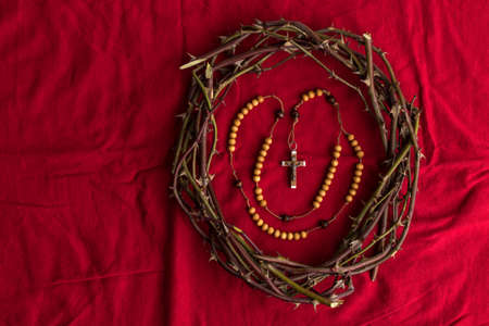 Crown of thorns and Rosary beads on red background. Easter and Christianity symbols with copy space.