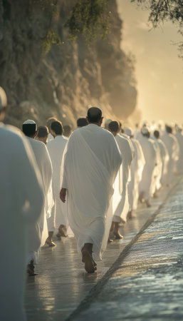 Muslim pilgrims in white robes journey together on the path of unity during hajj in mecca
