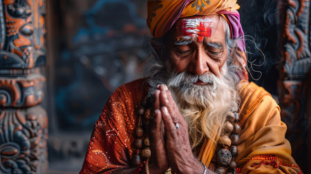Serene elder Asian man in traditional attire meditating with hands clasped