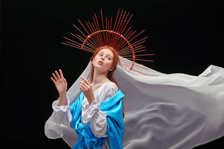 The Virgin Mary portrait on a dark background with rays of light. Modern art in religion.