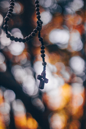Wooden rosary with cross - with bokeh in background