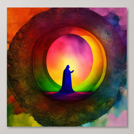 A majestic figure stands amid a surreal landscape bursting with color and energy, evoking themes of wisdom, spirituality, and creative inspiration.