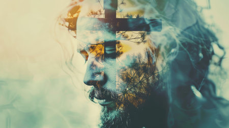 Double exposure portrait of woman and trees and cross. Christian concept.