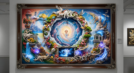 An incredibly detailed and ornate surrealist painting displayed in a modern art gallery. The artwork features a swirling celestial portal surrounded by a vibrant wreath of flowers,mythical creatures,and fantastical architecture,blending fantasy and technology.