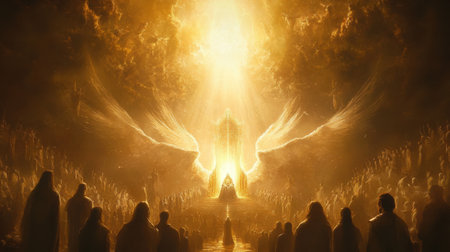 A group of figures gathers in a heavenly setting illuminated by a bright golden light. Ethereal beings with wings and a majestic throne dominate the scene, conveying a sense of reverence.