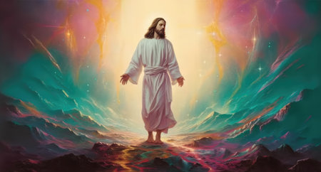 A digital artwork depicting Jesus Christ ascending into a colorful, abstract sky.