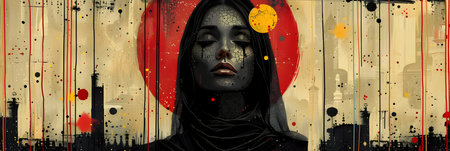 An artistic mural depicts a woman in meditation, radiating cosmic energy. The composition features vibrant colors, dynamic lines, and a celestial theme. This illustration may be suitable for wellness, spirituality, and artistic projects, providing a visual representation of inner peace and cosmic connection. Ideal for various commercial applications.