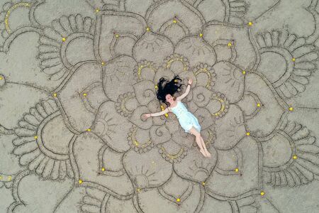 a large mandala painted on the sand on the ocean with a girl in the middle boho style.