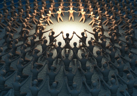 School friends coming together to form a united circle under a clear blue sky, representing teamwork and friendship