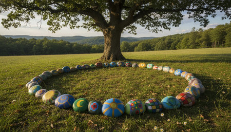 Brightly colored chalk outlines form a vibrant ring on rough asphalt, representing harmony in variety and collective strength in community.