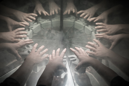 Hands Reaching for Indian Rupee Currency Symbol on Mirror Covered In Smoke With many Reflections of Itself