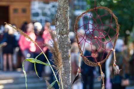Banner of Dream catcher with feathers threads and beads rope hanging. Dreamcatcher handmade