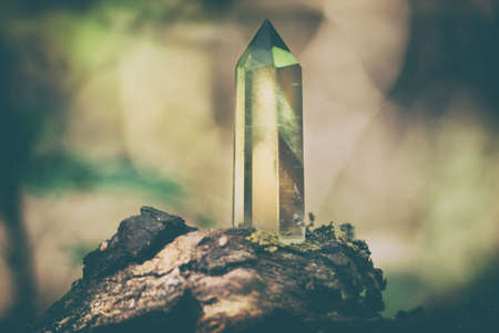 gemstone mineral on mysterious natural forest moss background, quartz crystal close up. Magic healing Reiki Crystal Ritual, Witchcraft, spiritual esoteric practice
