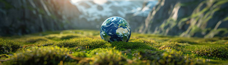 A 3D model of Earth sits on lush grass against a mountainous backdrop, signifying global environmental conservation