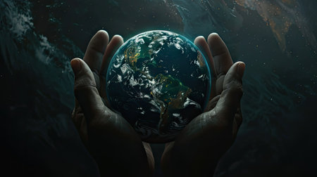 Two hands emerge from the darkness to gently hold a glowing Earth, conveying protection and responsibility for our planet.