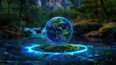 Earth in mountain lake; serene, realistic scene; digital art; environmental awareness; education; stock photo