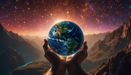 An AI generated illustration of Hands holding the Earth against a mountain backdrop