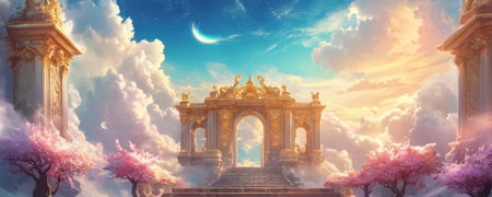 Magnificent ornate gate made of white marble and gold, standing tall among fluffy clouds and surrounded by lush greenery. This ethereal scene evokes a sense of paradise or heavenly entrance, with soft sunlight illuminating the intricate architectural details. Perfect for spiritual, fantasy, or inspirational themes.
