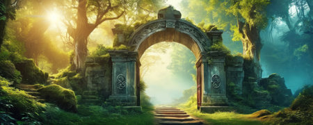 Mystical forest with stone gate at sunset. 3D rendering