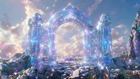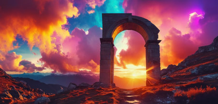 A captivating stone archway stands against a twilight sky, illuminated by a subtle glow. This mystical landscape captures the essence of ancient history and natural beauty.