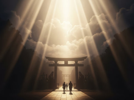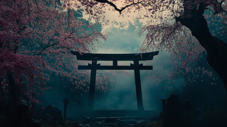 A tranquil silhouette of a torii gate surrounded by blooming cherry blossom trees in a misty landscape, creating a serene atmosphere perfect for meditation.