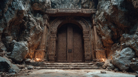 Ancient carved wooden door in rock cave entrance