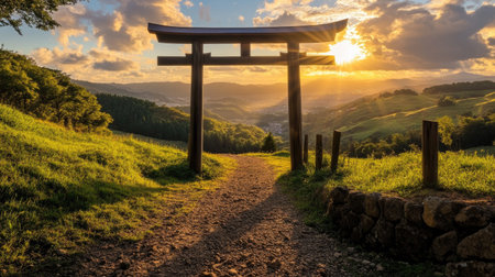 A stunning sunset view featuring a traditional torii gate surrounded by lush hills and a tranquil path. Perfect for travel and nature themes.