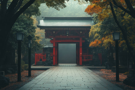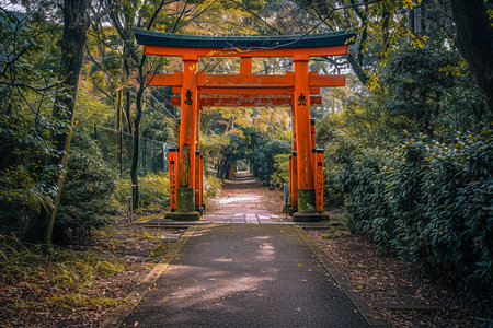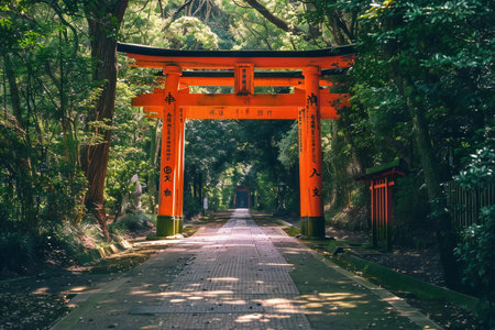 shinto shrine gate at the end of a stone pathway, created with generative ai