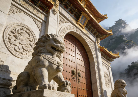 Explore the breathtaking intricacies of this ancient temple entrance featuring detailed carvings and a weathered stone finish, set in a serene natural landscape.