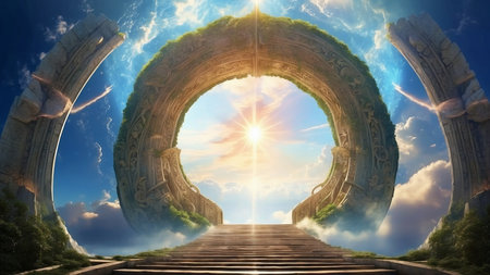 Stunning golden gates open to a radiant sky in this celestial scene, evoking feelings of awe and inspiration. Perfect for themes of spirituality and journey.