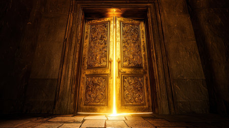 A grand, ornate golden door slightly ajar, emitting radiant golden light, symbolizing success, winner, and victory. intricate carvings and warm glow