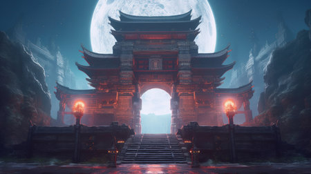 This stunning digital painting captures the beauty of the moonlit night, with a torii gate standing tall against the skyline. The artist has expertly combined Japanese influence with the style of Max Rive, resulting in a breathtaking piece that exudes vintage aesthetics. The dark red and gray hues add an air of mystery to the image, and the symmetrical balance creates a sense of harmony.