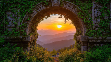 Sunset in the mountains through the arch of the stone wall.