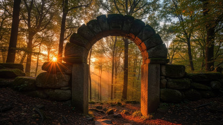 Sunset in the woods with an arch in the form of a gate