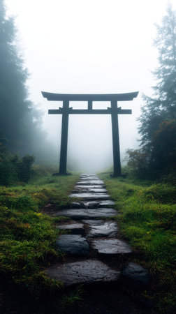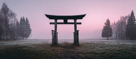 A tranquil scene features a traditional Japanese torii gate set amidst a misty landscape. Soft pink and muted green tones create a serene atmosphere. The composition emphasizes symmetry and depth with trees framing the view. Ideal for concepts related to travel, culture, or scenic design.