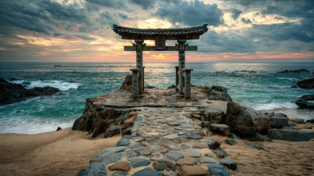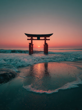 Stunning view of a torii gate at sunset, surrounded by gentle ocean waves. This tranquil scene captures the essence of serenity and beauty in nature.