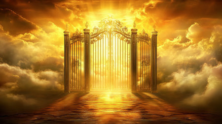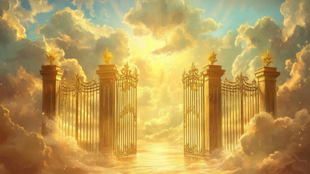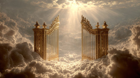 An illustration of golden gates, set in the middle of a cloud-filled sky, representing the concept of heaven and eternal peace. The glowing light adds a divine and serene atmosphere.
