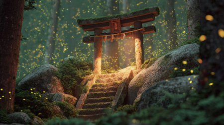 Discover a tranquil scene of an enchanted forest featuring a wooden torii gate. Illuminated by glowing fireflies, the lush surroundings invite exploration and serenity.