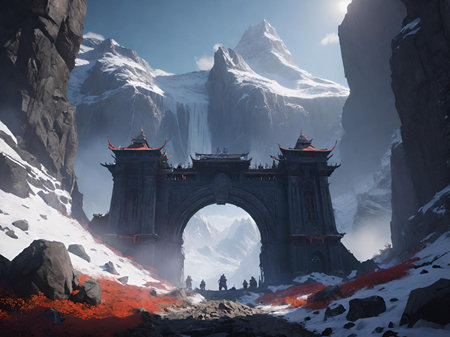 a gate in a mountain with a sky background